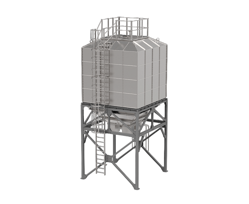 - Тип - Сборный оцинкованный бункер прямоугольного сечения со сборно-сварной опорой металлоконструкцией с площадкой, вертикальной лестницей для обслуживания, с воздуховодами и установкой осевого вентилятора